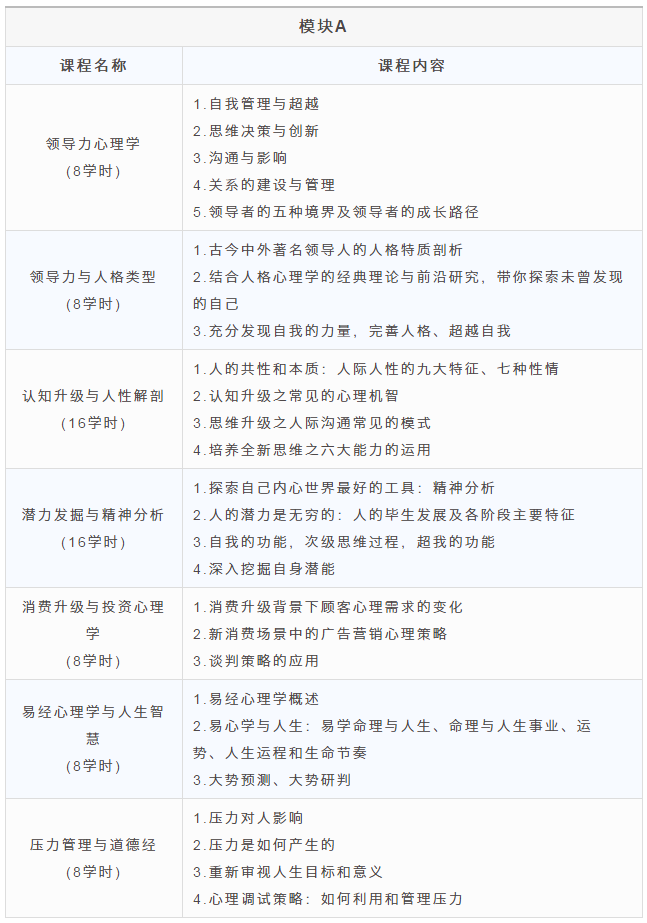 1.由来自清华大学、北京大学、北京师范大学等国内顶尖高校教授授课,国际著名心理学家作为课程技术支撑,主讲教授拥有丰富的学术背景及企业顾问经历,并且将西方先进心理学理论与实践成功应用于中国实际国情和环境,代表国内心理学理论与实践相结合的最高层次。