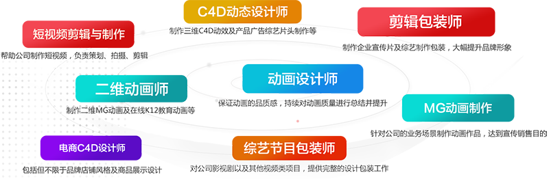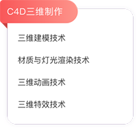 课程主要学习包装方案设计、AE栏目包装制作、AE合成特效制作、C4D三维制作、C4D三维设计、PR剪辑技术、实拍技术、商业案例实战及DEMO制作等课程内容,紧跟企业用人标准不断优化高薪技能。
