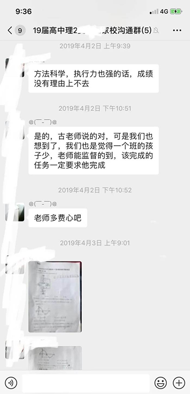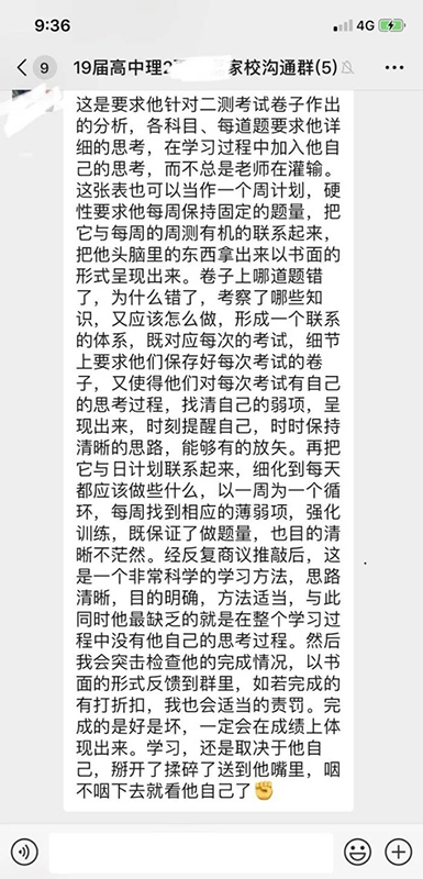 学校的管理模式是准军事化管理,不允许学生带任何电子产品,因此学校建立了家校沟通群,每天会有班主任将学生的学习情况发到群里,家长在家就能了解学生的学习情况,有问题也可以和班主任及时沟通,这也方便了有的家长由于工作的原因,不能实时地了解学生的学习情况。
