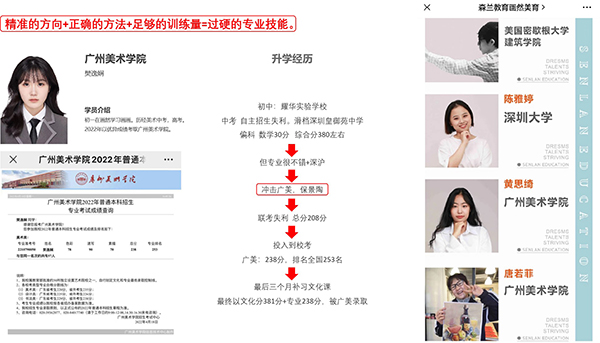 画然艺考晋升发展中心(中考、高考方向)是画然教育集团旗下专业美术升学教育品牌,画然教育集团总部位于深圳华侨城创意园,是拥有10年发展历史的全国专业美术教育连锁品牌。旗下设立【画然美育总部】【蘭·美术馆】【品牌课程研发中心】【画然教育学院】【画然文创(设计中心)】【画然艺考中心(美术中高考培训中心)】【美学素养工作室】【美学体验馆】。连续8年给清华、央美、国内外美院、综合性重点大学输送优质生源。与多家学校联合构建了中高考美术预科班和专业美术教育培训体系。面对新艺考形势的要求,画然艺考中心与时俱进全新升级,倾力打造严格的教学系统、细致的教学方向,全体系升级致力于冲名校,让每一个孩子能考上自己理想的大学。