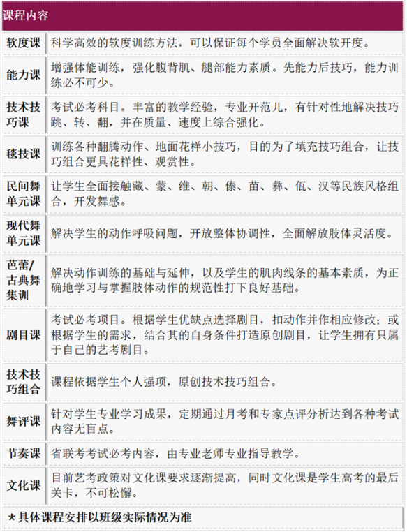 每班18人以内,并根据班级实际情况定制训练计划,有针对性地进行教学。让考生和家长及时掌握专业进展情况,熟悉考试程序。课程包括中国舞古典舞、毯技课、身韵课、剧目课、技巧课、软度课、节奏课理论课。