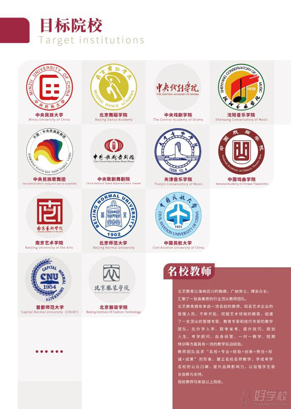 北艺教育拥有来自名校的教师、知名艺术企业的管理人员,不断开拓、挖掘艺术领域的精英,组建了一支优秀的管理专家、教育专家和技巧专家的教学团队,在升学入学、联考省考、提升技巧、规划人生、考学顾问、自身经营、一对一教学、短期特训等方面具有教学实战经验。