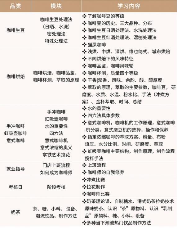 一个月内将咖啡生豆、处理法+咖啡烘焙+萃取原理+意式咖啡+咖啡拉花+潮流奶茶,各类咖啡设备掌握;冲煮+拉花+咖啡师比赛;将理论与实操的多重保障;熟悉门店上班流程及如何做一个咖啡师!