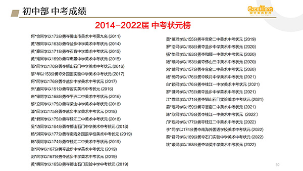 卓艺美术针对佛山美术中考而设计的方向,从入门到进阶到备考冲刺,环环紧扣有不可复制性的教学系统,每年定期组织老师与中考老师进行交流摸清每年考试要求熟悉各高中录取原则,给家长学生在专业方面有很强的定心针。从2013年开始设立初中班,录取率每年节节上升。每届所带学生勇夺各校榜首,专业是我们树立的品牌与口碑的基石。