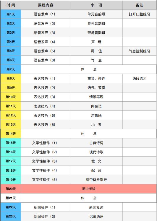 本课程面向参加高考升学,选择播音艺考的高一、高二、高三同学,课程内容针对播音艺考的艺术教学,从基础能力塑造、专项内容提升、冲刺集训教学三大阶段展开,针对播音艺考的考试内容:自我介绍、自备稿件、新闻播报、模拟主持、即兴评述等考试项目展开针对性的专业教学。