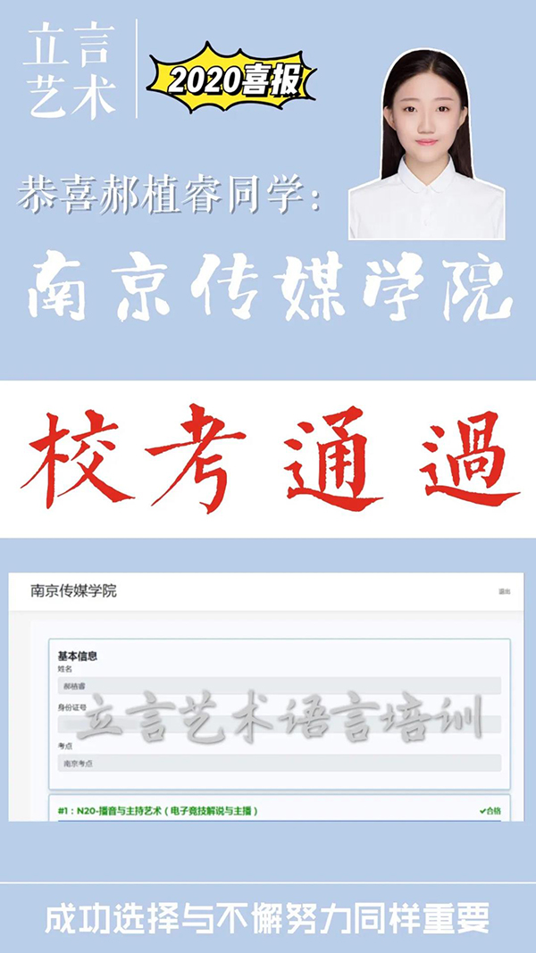 立言艺术语言培训创办于2019年,主要招收致力于艺考的初、高中学生群体,以及对语言艺术感兴趣的社会群体。浙江传媒学院资深播音教授尚咏梅老师亲自授课,立言艺术在尚老师的带领下,自编教材,小班化教学,针对性的课程设置,因材施教。已取得浙江省统考100 %通过率。大部分学生成功通过各学校校考拿到校考合格证。