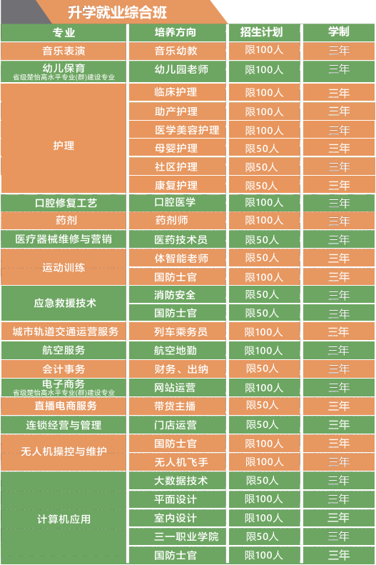 学校全日制在校学生4000余人,教职员工230余人。开设有音乐、会计、幼儿保育、护理、医疗器械维修与口腔修复工艺、直播电商服务、应急救援技术、营销、运动训练、计算机应用、电子商务、无人机操控与维护、航空服务与城市轨道交通运营服务、连锁经营与管理等热门专业,有各类实训室(中心)47个,与20多所高校建立对口升学和人才培养合作关系,对口升学几率稳定在95%以上,与50多家知名企业深度校企合作,学生就业几率高。