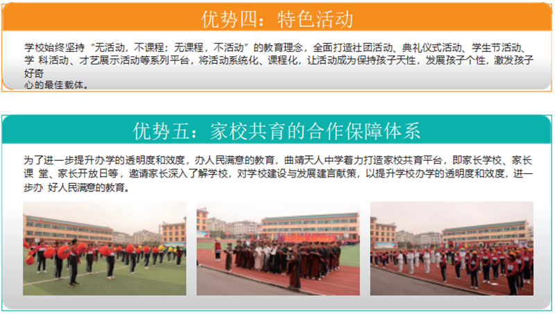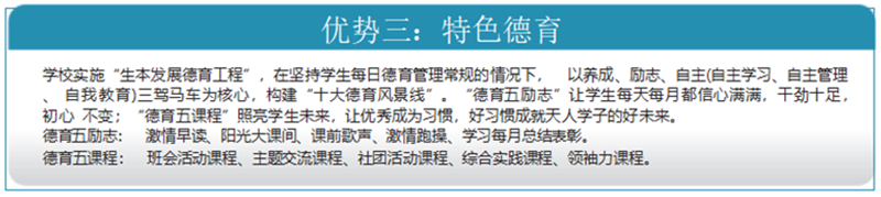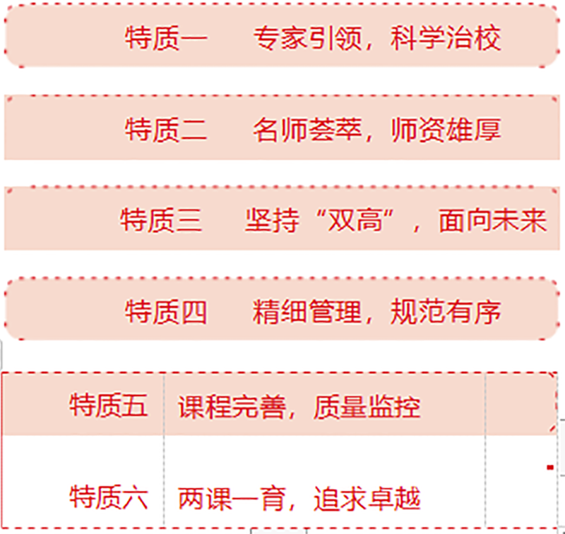 卓越德育、精品社团、品质教师、高效课堂、优质服务