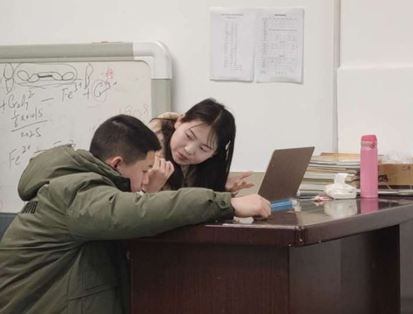 晚自习4节课,每堂课均安排教师进课堂弯腰低头垂问学生学习情况,为学生及时释疑解难。