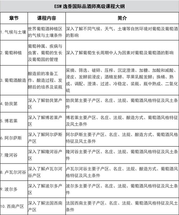 ESW逸香国际品酒师认证课程(Ease Scent Wine&SpiritsCourse),是国际范围内授课内容更符合中国人思维习惯的中文国际品酒师认证课程,课程囊括从入门到专业级必备知识技能,满足国内葡萄酒爱好者及葡萄酒行业一线从业者的培训需求。ESW是西北农大葡萄酒学院指定品鉴课程,亦被众多大型葡萄酒企业列为企业内培训指定课程,在葡萄酒行业具有大众瞩目的权威性和专业性。ESW更是在加拿大、新加坡、澳大利亚、意大利等海外地区落地生根,广受海外华人的追捧。