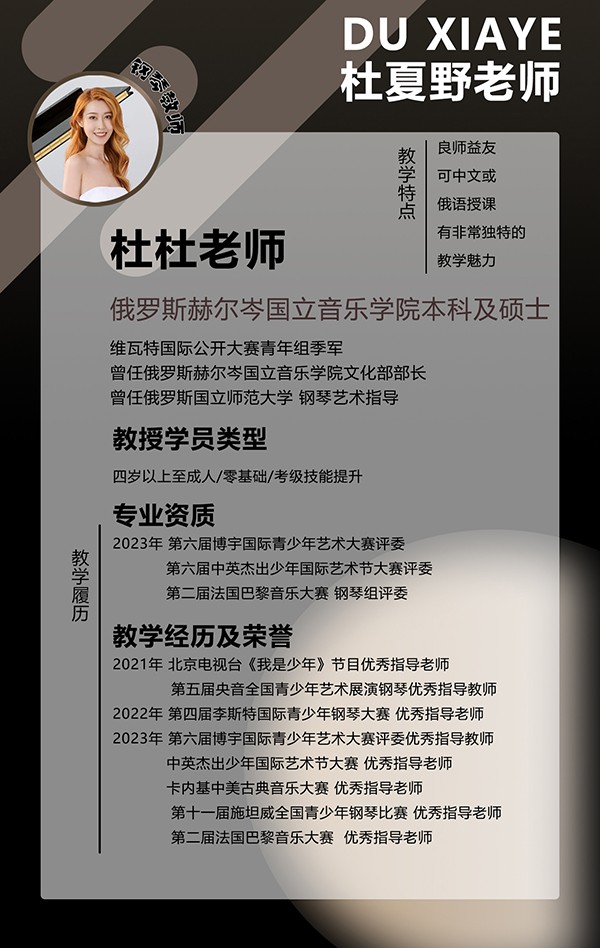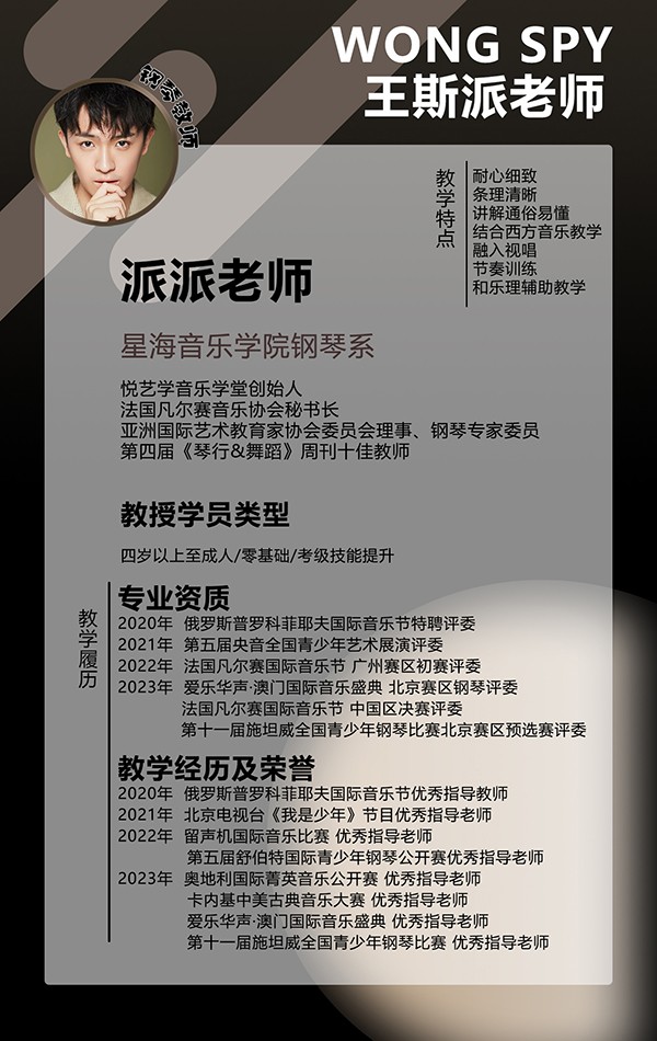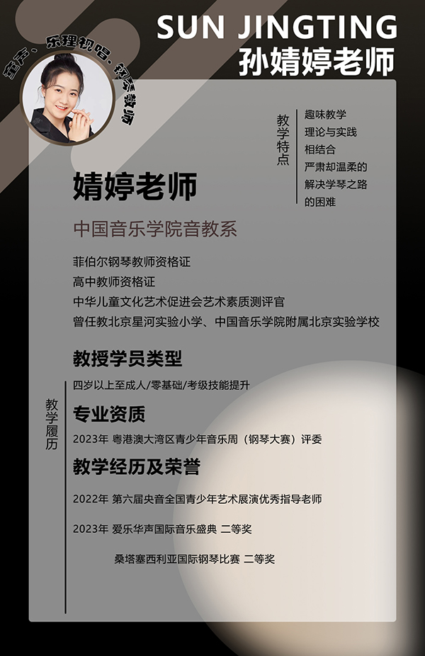 我们拥有专业的教师团队,教师均是由专业音乐学院和拥有海外留学经历的教师组成,大部分课程提供双语教学,在这里无论是幼儿儿童,少年甚至成年人,都会有源源不断的课程可以学习,此外我们]还有贴心的音乐管家为您服务,建立只属于您的个人档案,确保您学习的专业性和持续性,并且由音乐管家实时跟进学习进度,学习情况制定更完善学习计划。