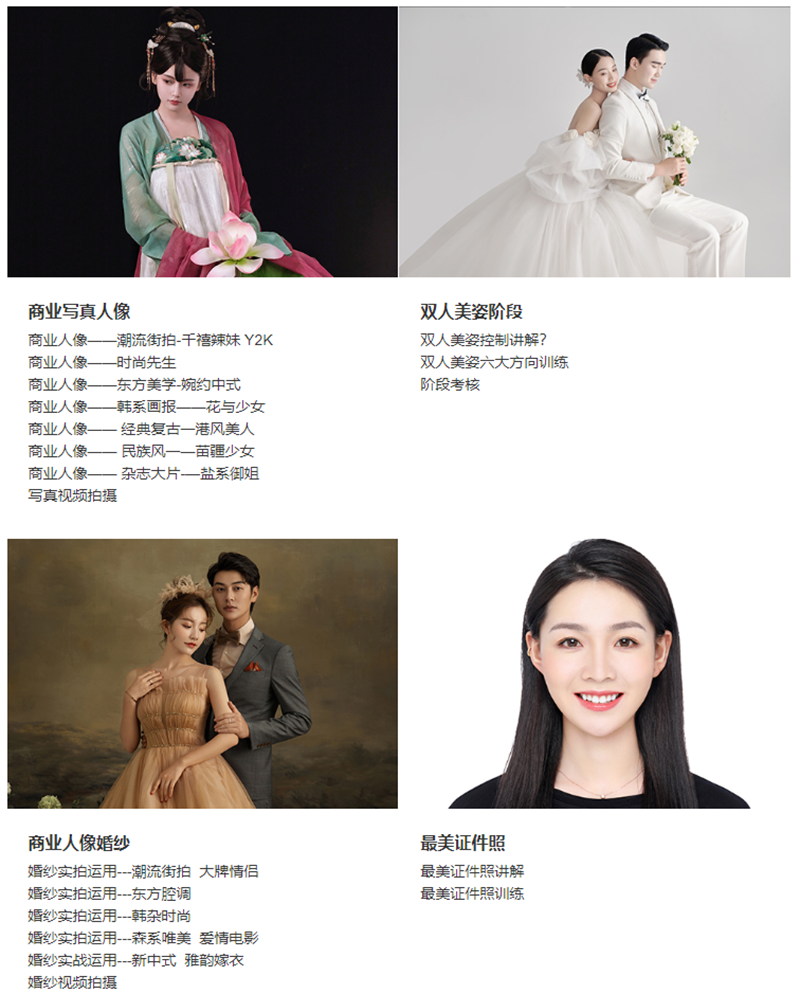 针对人像摄影市场需求,全方位系统化实战教学,全面学习相机的使用操作、玩转相机的高级使用技巧。系统学习最美证件照、个人肖像、企业员工形象照、团体合影、宠物摄影、儿童摄影、孕期写真、校园写真、婚纱摄影,重点剖析时尚写真、私房、婚纱摄影,理论实践结合,室内户外兼修,前期后期并重,后期软件:set.a.light 3Dstudio数码影室布光、ACR照片转档技巧、Photoshop商业化人像精修及后期排版设计、lightroom风格化调色、Capture One高级色彩管理。培养高素质、专业性摄影师,既能胜任人像摄影所有工作岗位,亦可自主创业。