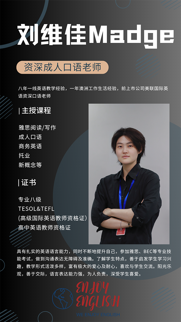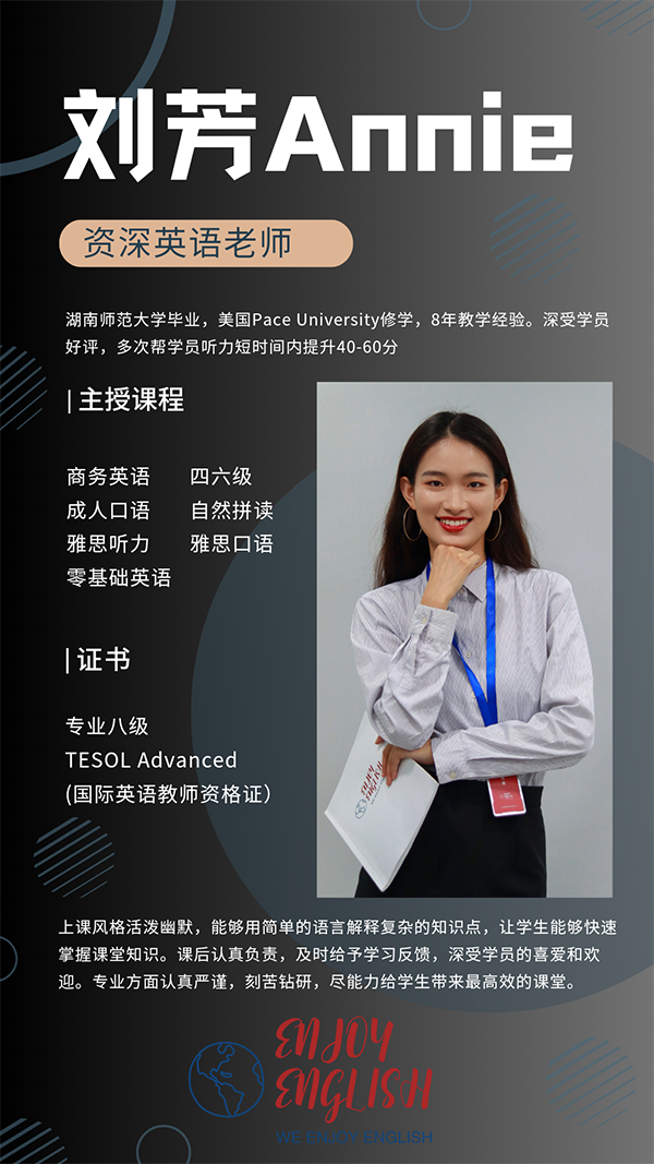 师资团队能力卓越,平均5-7年成人英语教学经验,具备教师资格证与tesol/tefl等国际英语教师资格执照,老师寓教于乐,能精准找到学生英语痛点,给出学习规划。深受大学生/职场人士/上班族等成人喜爱。来英茁,enjoy English!