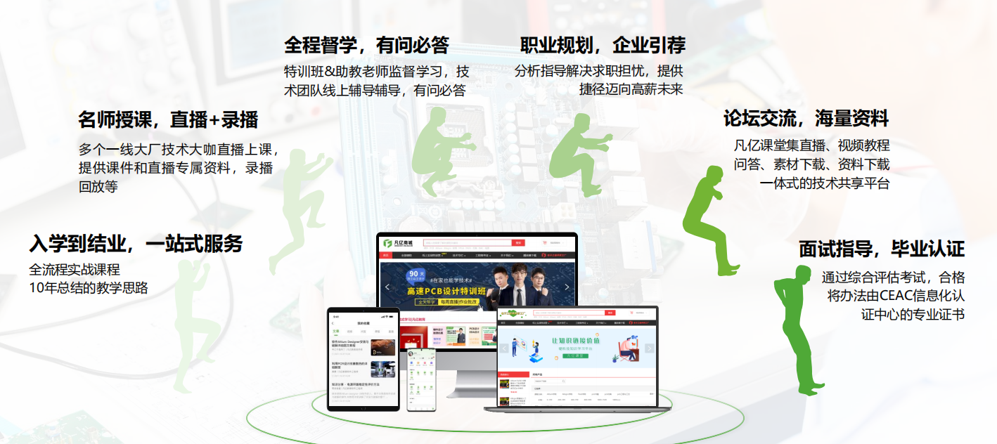凡亿教育PCB设计课程全面覆盖Altium Designer、Cadence Allegro、Mentor PADS及国产立创EDA等主流软件应用,深入讲解电源模块、多层PCB设计、高密HDI板及常用接口技术,融合框架性模块化思维,助力学员轻松应对各类PCB设计挑战。课程融合专业课程与企业素养两大培养体系,通过线下实体、班级式线上、1对1导师培训及线上自学等多种模式,结合丰富实操与答疑,快速构建知识体系与实战能力。学员可获国家信息化计算机教育认证,由平均从业15年以上大厂工程师执教,享受专业师资与荣誉加持的教学服务。课程好评率高,助力学员高薪就业于航天通信、华为等知名企业。