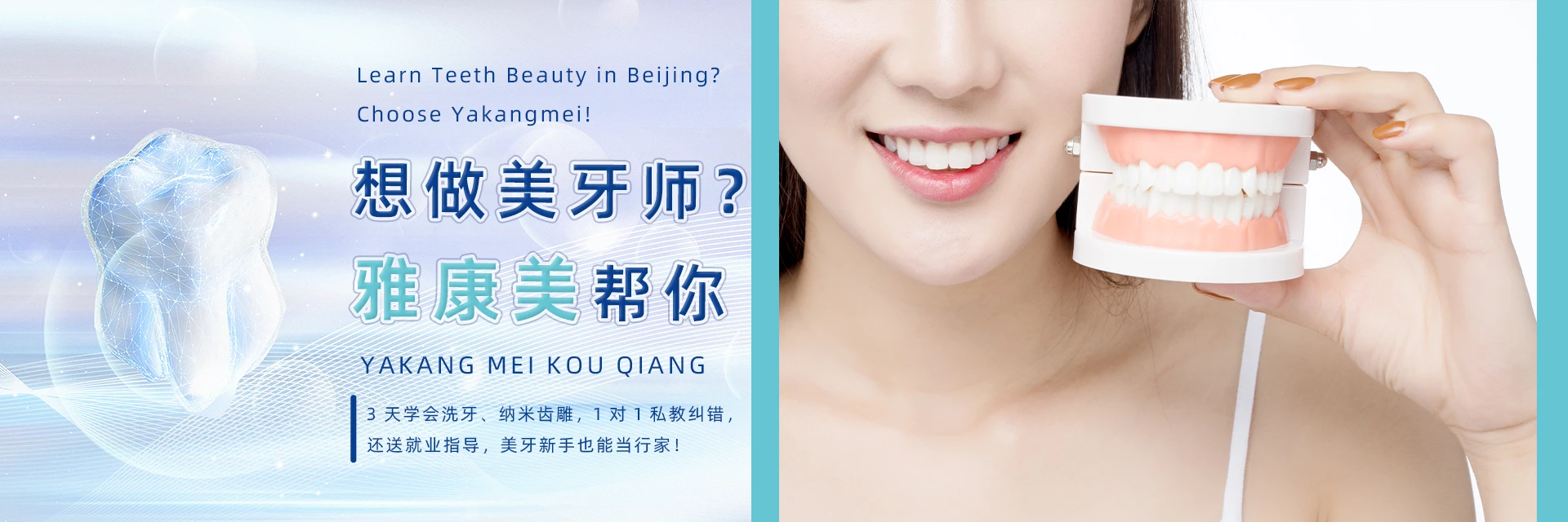 北京雅康美美牙口腔培训中心坐落于北京繁华地带,是一家集销售、服务、培训于一体的专业口腔机构。雅美康口腔医院由张金伟院长与中国第1一批种植医生庞建魁院长于2012年联合创办。中心拥有强大的专家团队、精湛的技术实力和先进的设备仪器,并由北京大学荣文笙教授提供指导。我们秉承诚信为本的原则,以口腔美学为源头,打造美牙培训总部,省去中间环节。中心汇聚精英团队,凭借精湛的技术和高度的责任心,创造了无数美丽故事,赢得了业界的一致好评。同时,我们不断创新和突破技术应用,将先进的产品理念和丰富的研发经验相结合,力求为学员提供最前沿、最实用的口腔美学培训。
