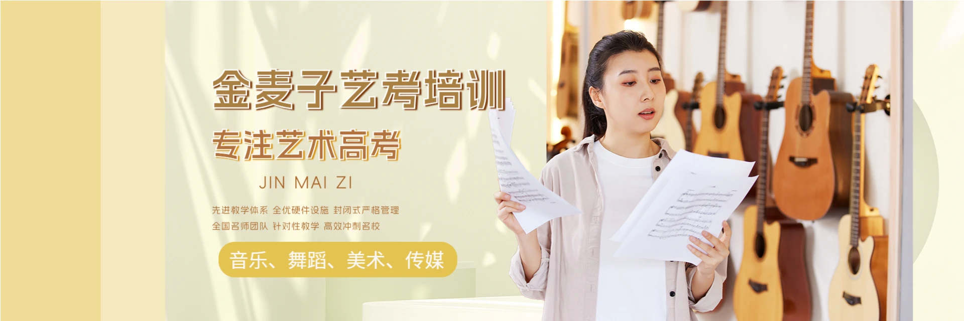 金麦子培训学校坐落于长沙雨花区职教城,占地近30亩,建筑面积20000多平方米,教学设施齐备,建有教学大楼、宿舍大楼、音乐厅、舞蹈排练厅15间、专业琴房100间及多媒体报告厅等功能室;中央空调全覆盖,寝室配24小时热水器、洗衣机、独立卫生间;实行封闭式管理,配备专职班主任与特色管理制度;师资由全国优秀教师及艺术院校品牌教师组成;开设舞蹈、音乐、美术、传媒等艺考专业培训。