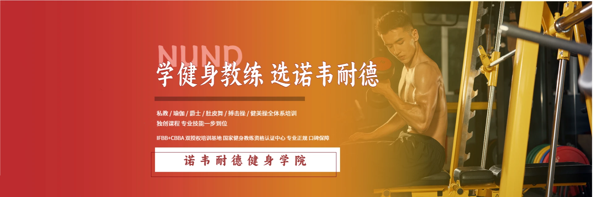 诺韦耐德是中国高端健身教练人才培养机构,IFBB职业国际私教授权培训基地、CBBA专业健身教练人才培训基地。总部位于长沙,拥有长沙、武汉、成都、重庆、广州、上海、青岛七大直营校区,实训场地超30000㎡,设施完善、师资力量扎实。秉承个性化实践驱动教学,以提升全民健身标准、提高职业健身教练培训质量为己任,覆盖全国培训范围,助力学员实现职业发展。