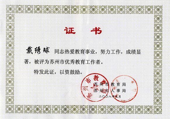 荣获“苏州市优秀教育工作者”称号