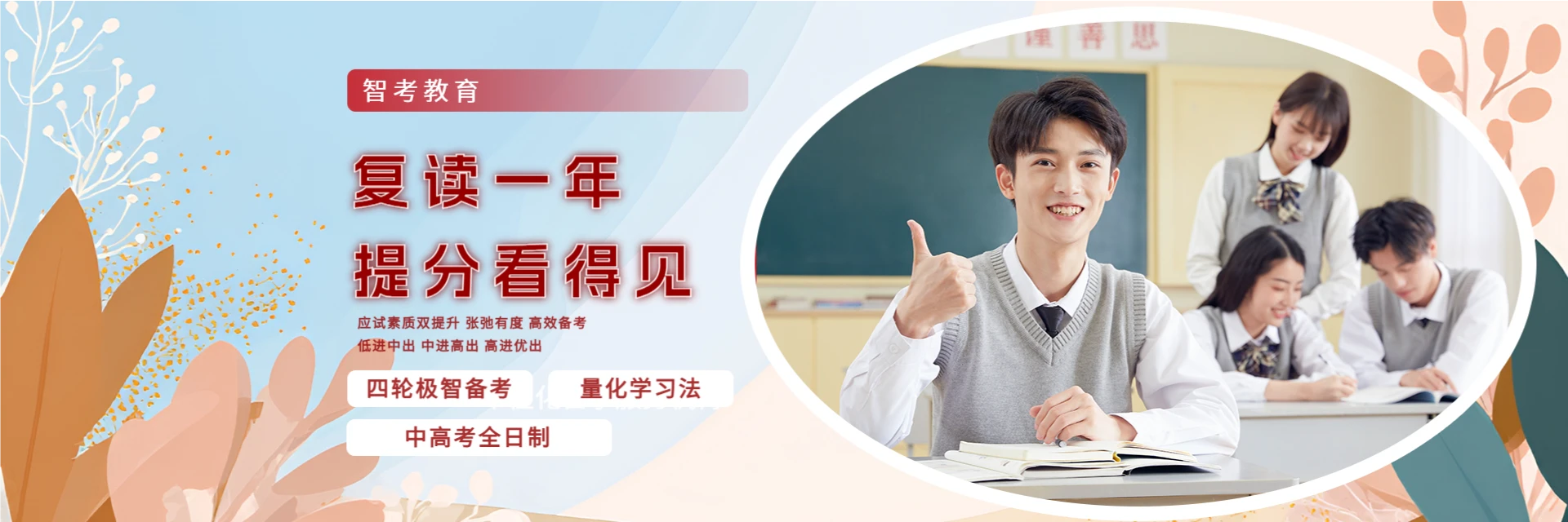 智考教育是一所拥有12年办学经验的全日制补习学校,专注中高考及艺考生文化课提升。校区占地约1.5万平方米,配备多媒体教室、实验室、图书室、篮球场、塑胶跑道、多功能餐厅等;男女生宿舍分区,空调暖气齐全。教职工100余人,依托大数据构建智能化教学体系,融合应试与素质教育,有效提升应考能力、缓解备考焦虑。办学以来服务学生4万余人,初中生平均提分120分以上,高考一本达线比例达52%,二本达线比例达85.6%。校训:学为人师,行为世范;理念:让教育更高效,让学习更轻松。